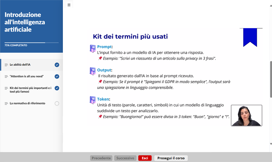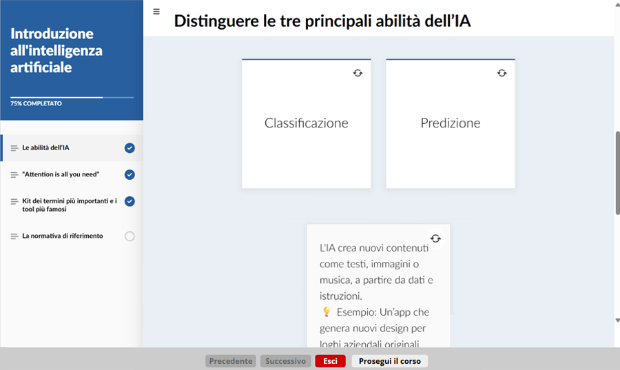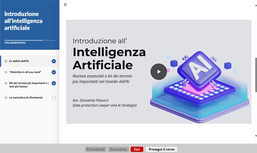 Il corso offre una prima panoramica sull’Intelligenza Artificiale (IA), analizzandone le caratteristiche principali, le modalità di funzionamento e le implicazioni pratiche e normative, con l’obiettivo di guidare verso un utilizzo consapevole e strategico delle tecnologie intelligenti e di far comprendere il ruolo sempre più centrale dell’IA nella vita quotidiana e nel mondo del lavoro.