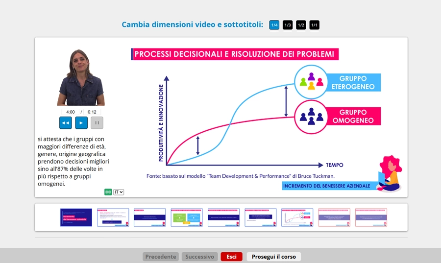 I contenuti sono supportati da metodologie didattiche attive, che garantiscono il coinvolgimento dell’utente durante la fruizione: possono essere presenti esercitazioni che forniscono un feedback immediato sull’apprendimento, filmati di approfondimento che rendono chiaramente comprensibili gli esempi a cui si riferiscono, documenti di approfondimento che consentono all’utente di incrementare le informazioni di base fornite dal corso. Le domande comprese nei test sono facilmente comprensibili e sono inerenti ai contenuti delle lezioni. I quesiti sono esposti in modo casuale, per garantire l’impossibilità di proporre test uguali a diversi utenti e in caso di mancato superamento da parte dell’utente.