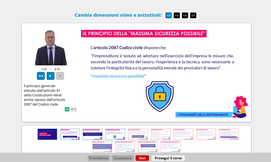 La durata del corso risponde alle richieste di legge. Il tempo impiegato dall’utente a prendere visione dei vari componenti del corso è misurabile, senza applicare nessun coefficiente “arbitrario” (ad esempio assumendo che un’ora di e-learning equivale a 2 ore d’aula).