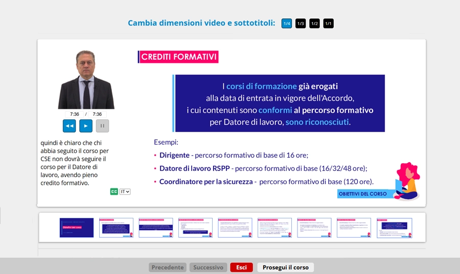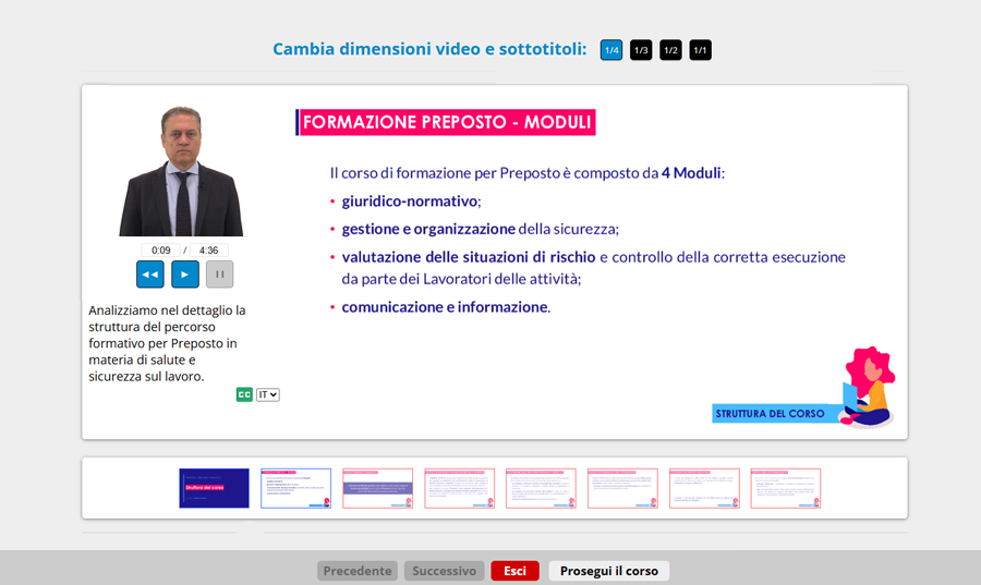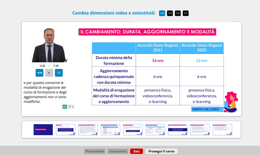 La durata del corso risponde alle richieste di legge. Il tempo impiegato dall’utente a prendere visione dei vari componenti del corso è misurabile, senza applicare nessun coefficiente “arbitrario” (ad esempio assumendo che un’ora di e-learning equivale a 2 ore d’aula).